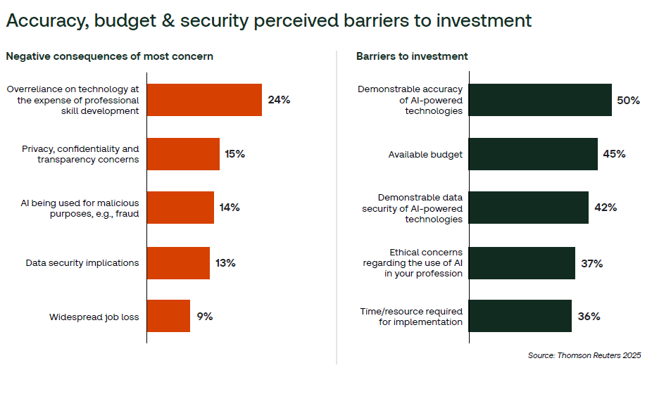 Budget, data security, and ethical risks follow closely. Professionals also worry about overreliance. Some fear that offloading too much to AI will erode essential skills. The paradox: the tools that free us may also deskill us.
