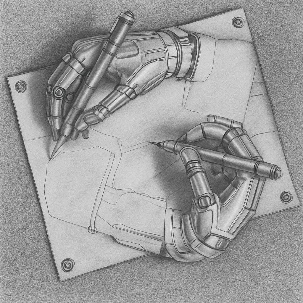 Like Escher’s Drawing Hands, the process feels self-aware, each “hand” shaping the other until the original starting point is unrecognizable.